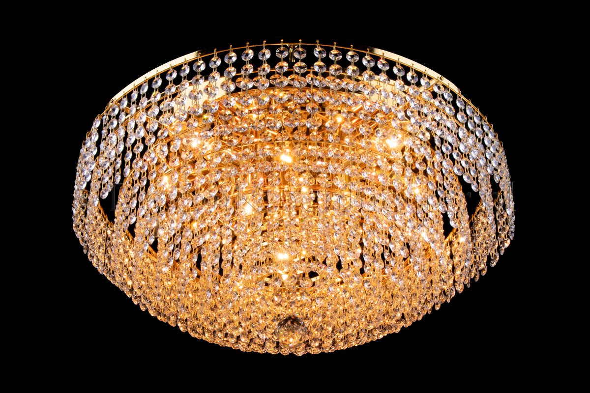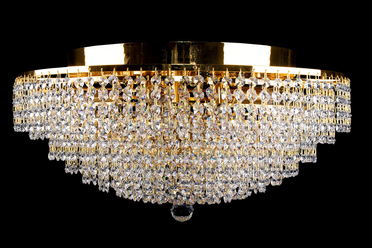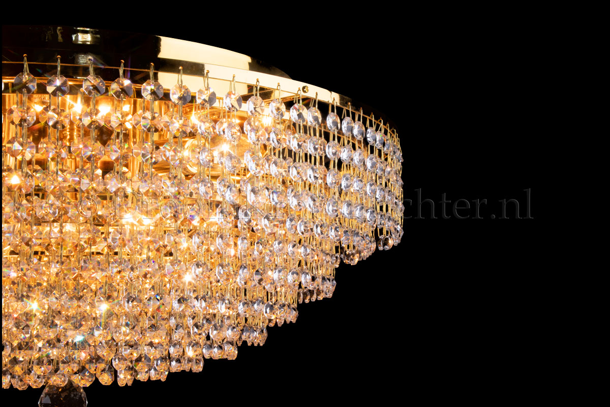 Diese klassische Deckenleuchte der Salle-Serie hat 8 Lichtpunkte, einen Durchmesser von 60 Zentimetern und eine Höhe von ca. 30cm. Diese Deckenleuchte besteht aus wunderschönem Kristall und hat goldfarbene Kanten. Die Kristall-Deckenleuchte Livia von 60 cm verleiht Ihrem Raum ein warmes und attraktives Aussehen und behält gleichzeitig die Höhe Ihrer Decke bei.