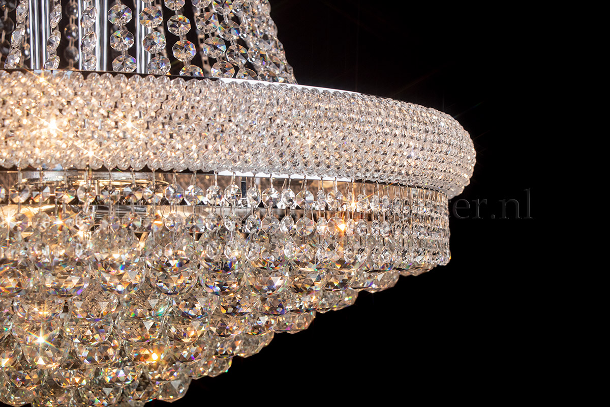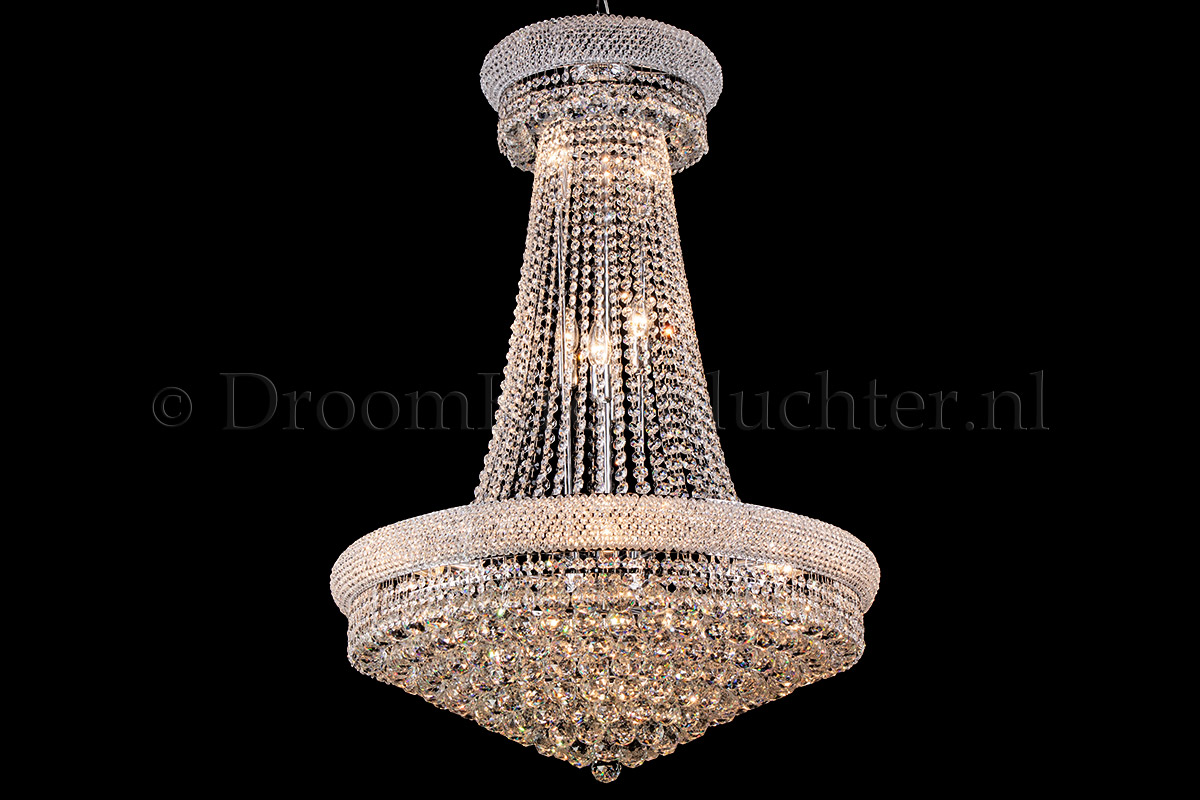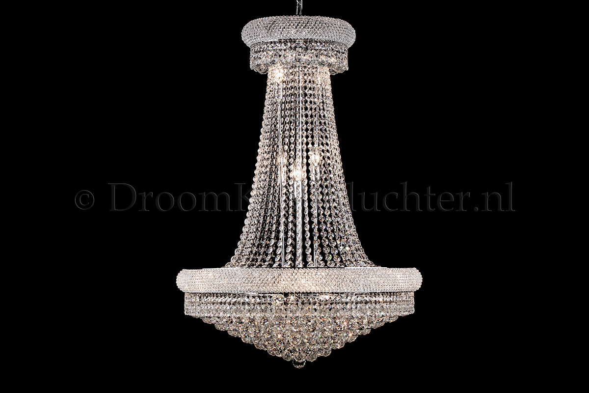 Dieser klassische und vielschichtige Korbluster hat 15 Leuchte. Der Durchmesser beträgt nicht weniger als 80 Zentimeter und die Höhe nicht weniger als 110 cm. Dieser Korbluster ist aus schönem Kristall gefertigt und hat ein Chrom-Finish.