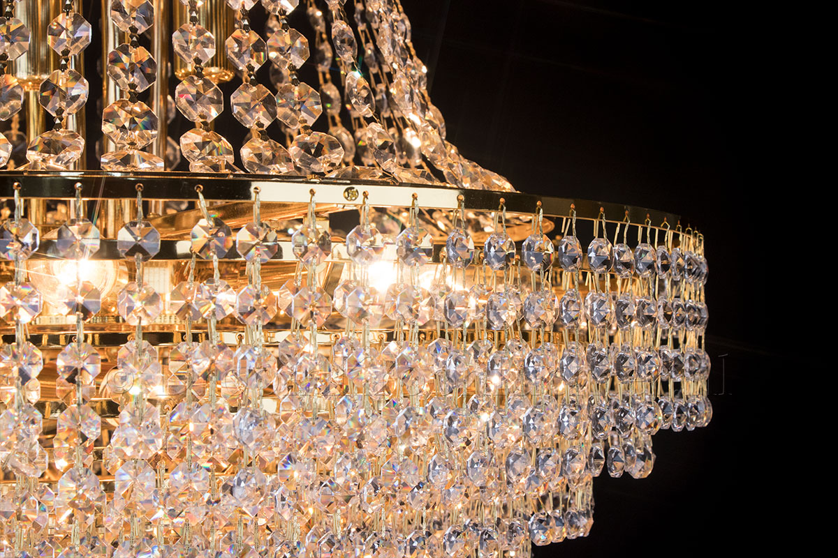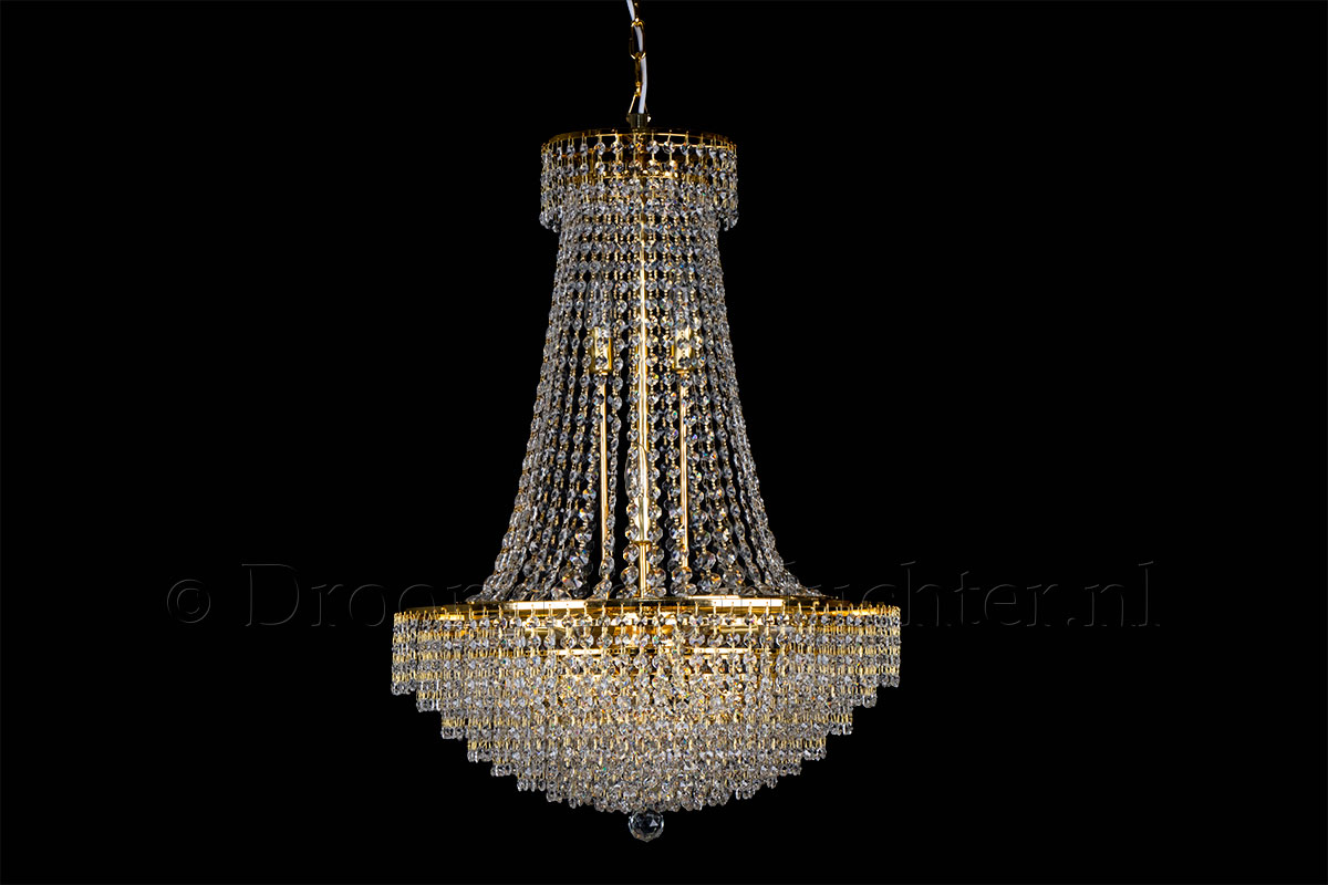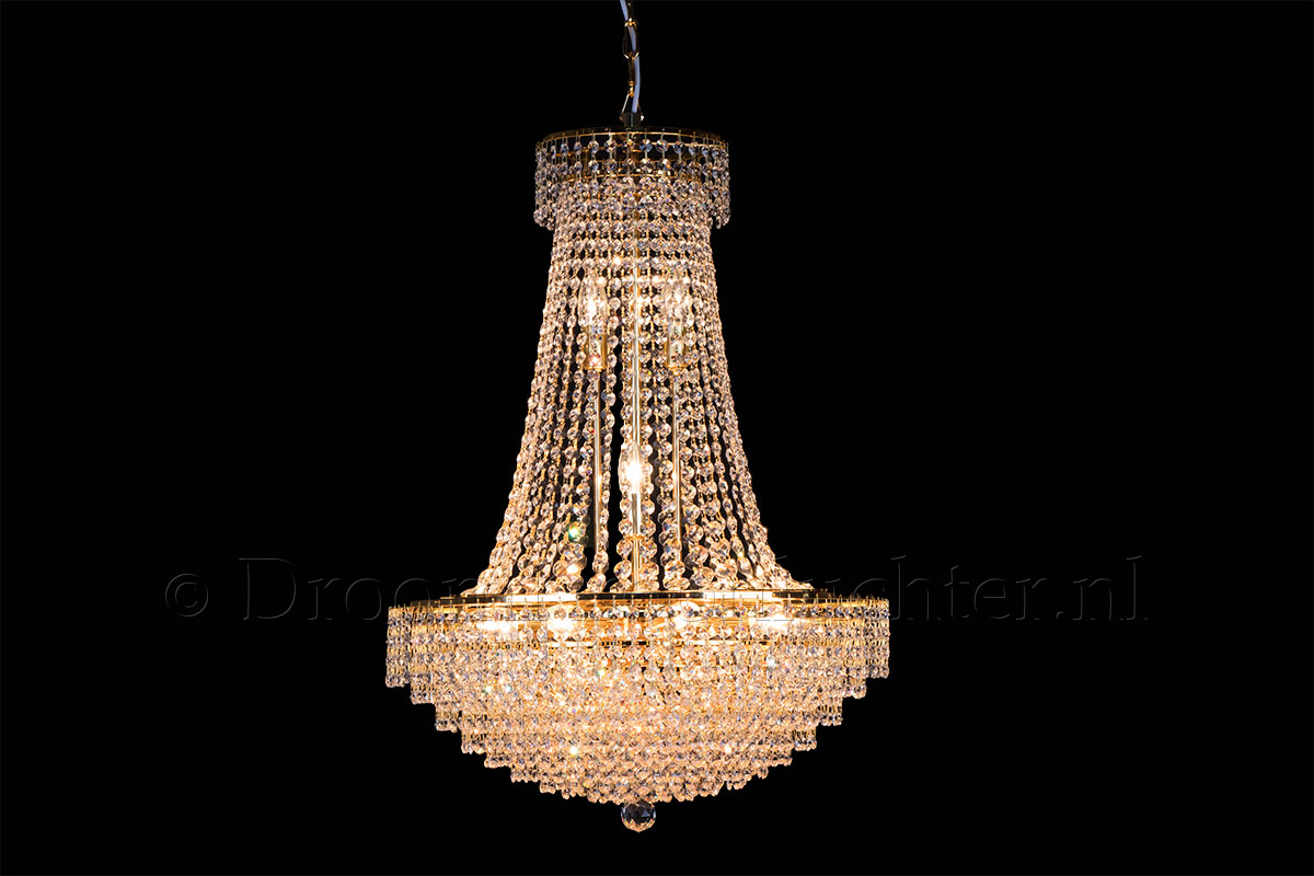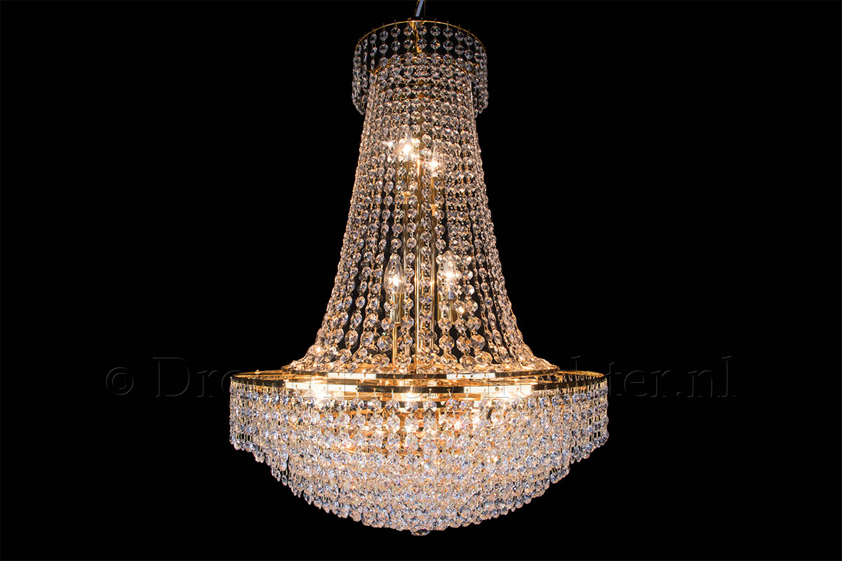 Dieser klassische und mehrschichtige Korbluster hat 15 Lichtpunkte, einen Durchmesser von 58 Zentimetern und eine Höhe von 80 cm. Der Boden enthält 9 Kristallschichten. Dieser Korbluster besteht aus wunderschönem Kristall und hat goldene Ränder. Der Kristallbeutel-Kronleuchter verleiht Ihrem Raum ein warmes und attraktives Aussehen. Ein wunderschöner Korbluster zum Traumpreis! Jetzt bestellen.
