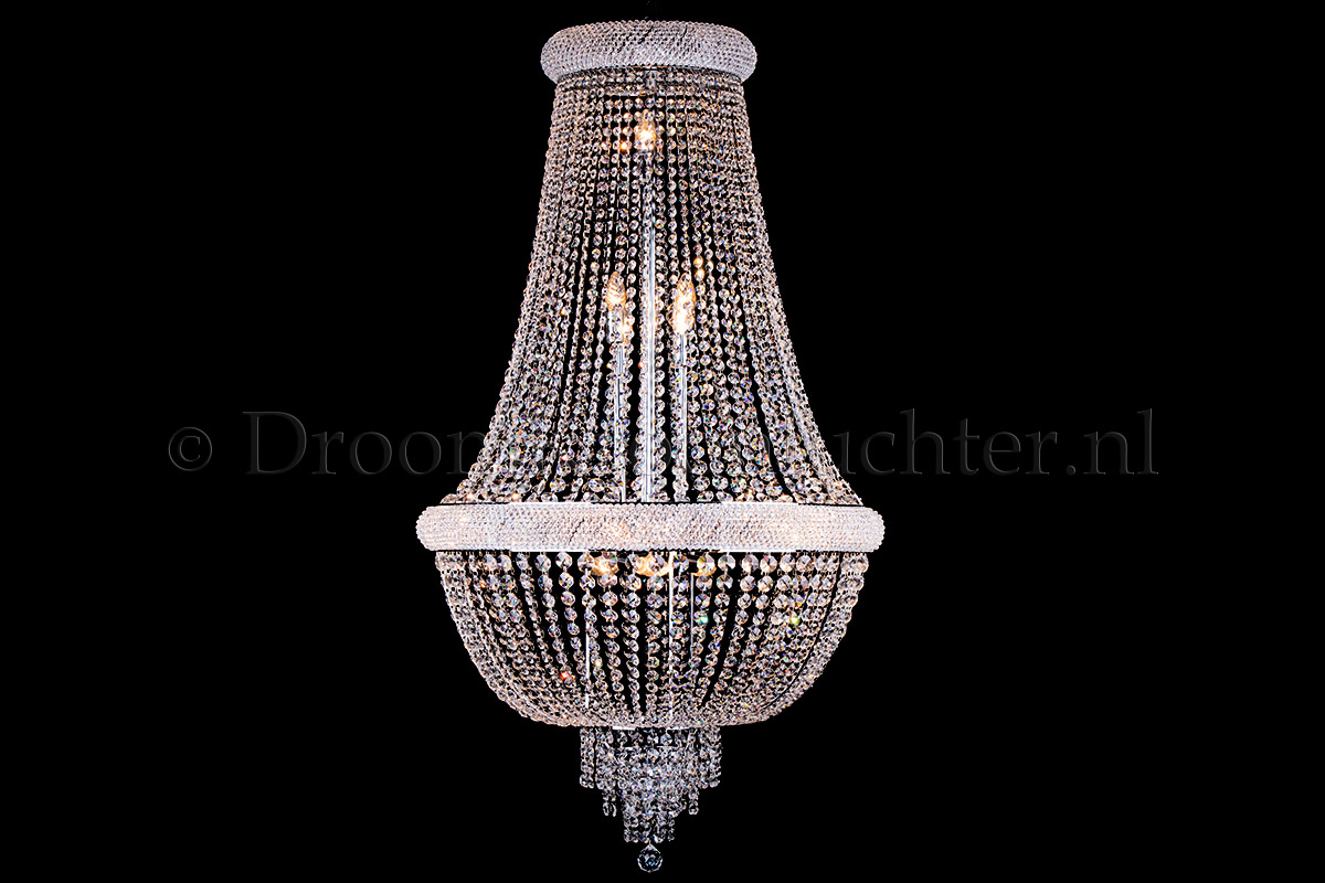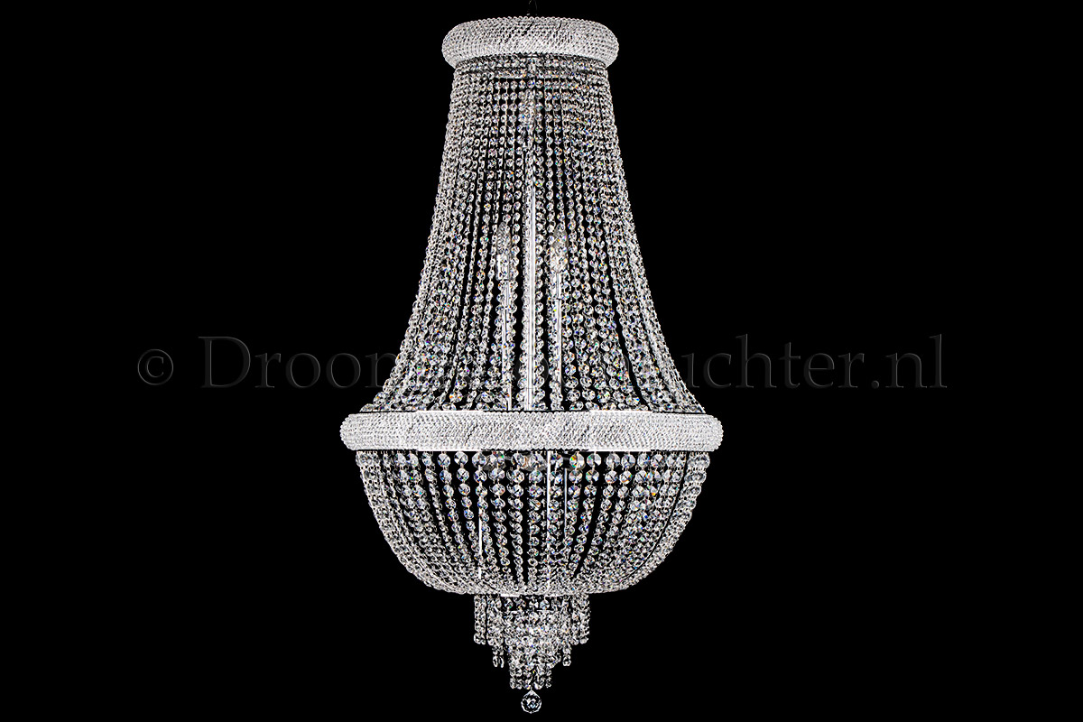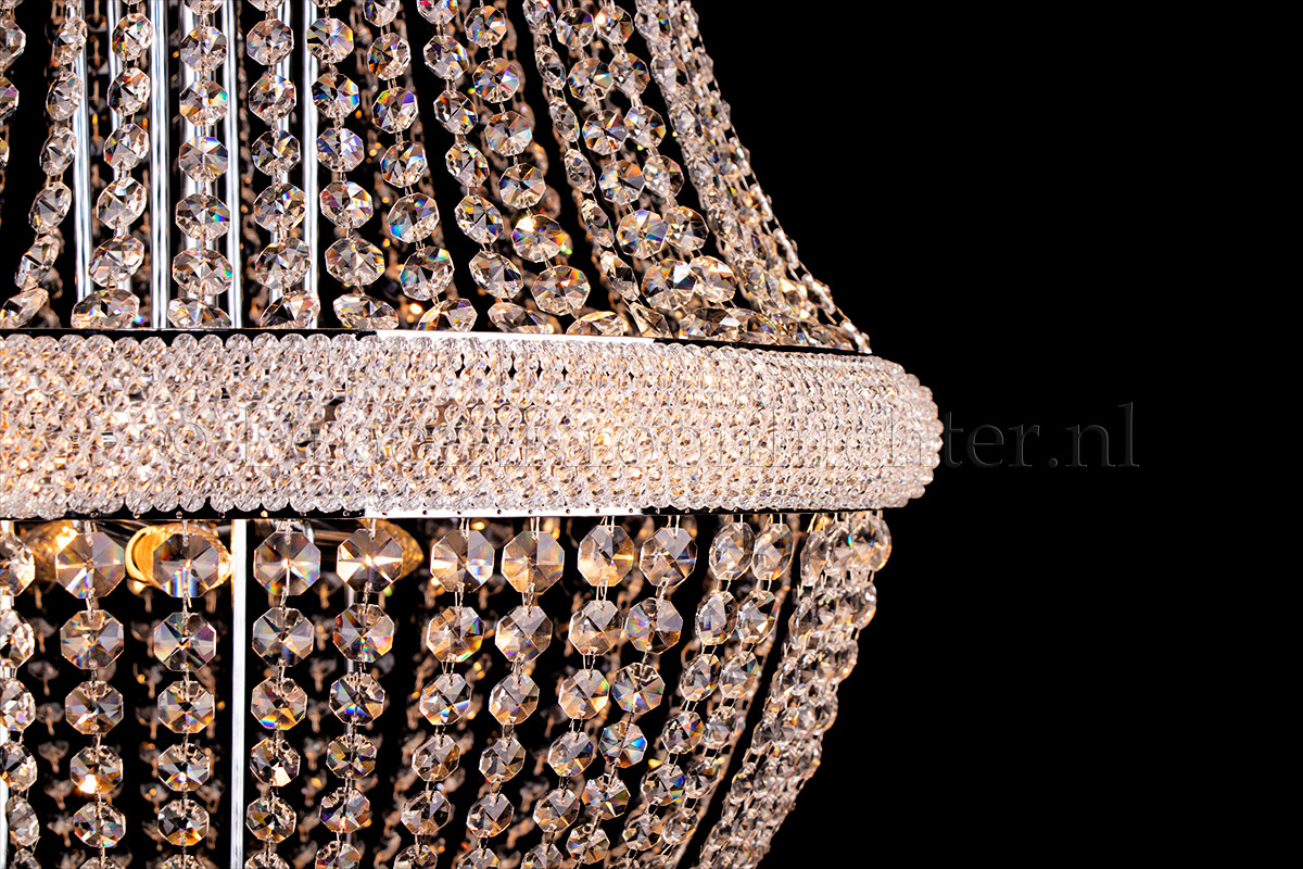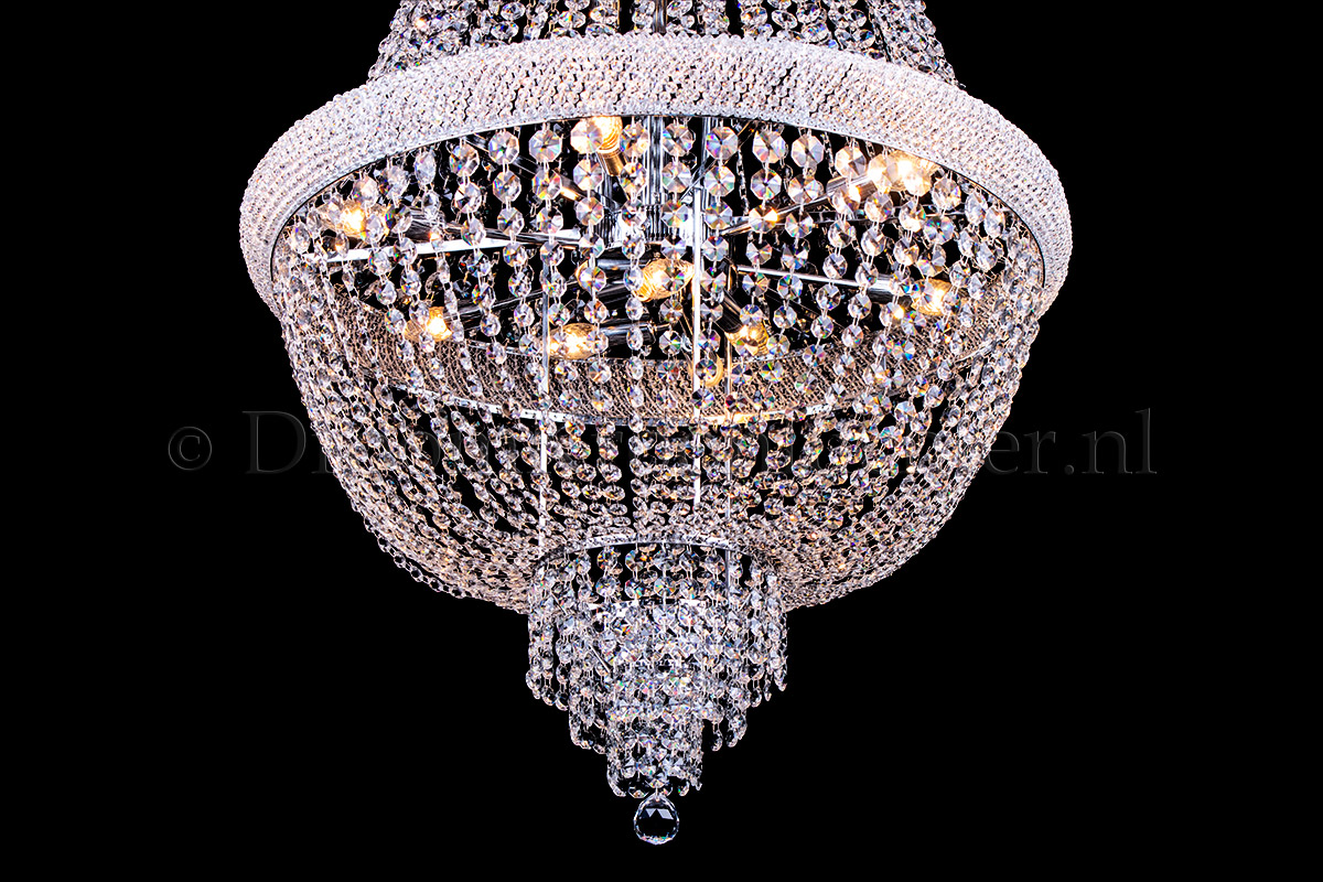 Der Korbluster Pallazo ist mit hochwertigem Kristall tapeziert und mit verchromten Metallteilen perfekt veredelt. Die Stränge sind aus hochwertigem Kristall mit einer schönen Kristallkugel an der Unterseite.