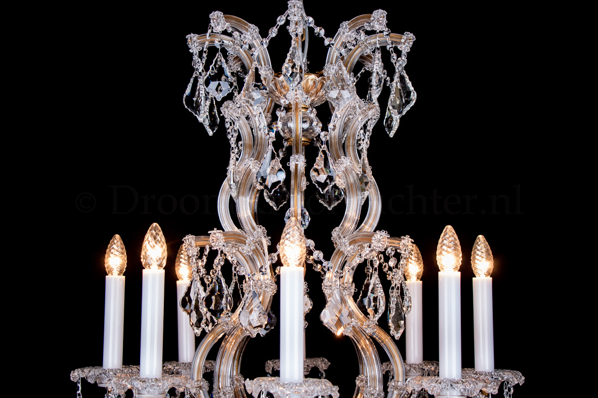 Ein verschnörkelter Kristalllüster mit 8 Leuchten. Der 8-flammige Louis Baroque-Kronleuchter ist hochwertig verarbeitet und hat eine bronzen Farbe. Die Pendelleuchten sind aus hochwertigem Kristall gefertigt, die Armatur ist eine Kombination aus Metall und Glas. Die Kerzenfassungen sind nicht weniger als 15 cm hoch und bestehen aus weißem Glas. Die Anhänger dieses Kronleuchters sind extra groß, um einen atemberaubenden Effekt zu erzielen.