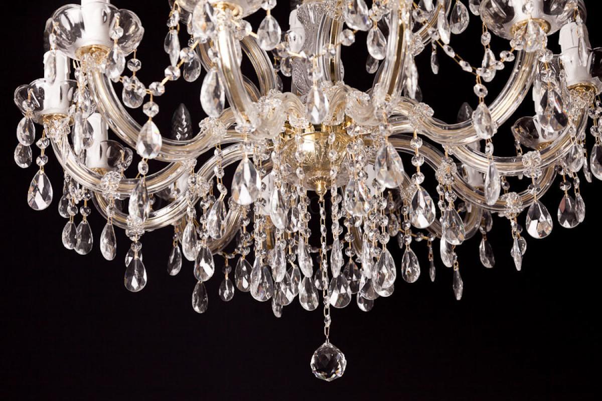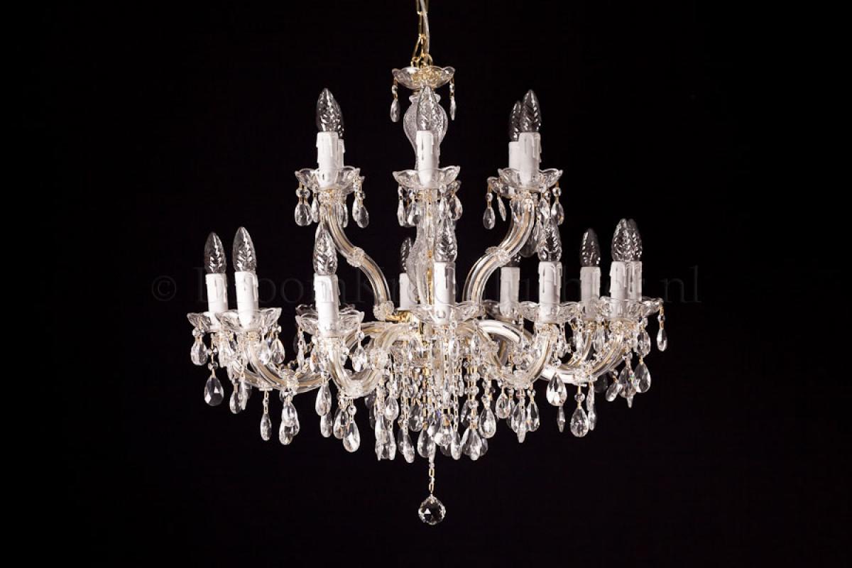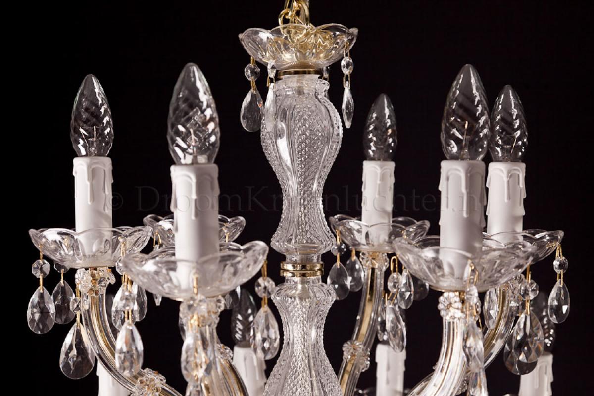 A beautiful glass chandelier with 18 arms. The glass chandelier Maria Theresa is gold coloured with a perfect finish.