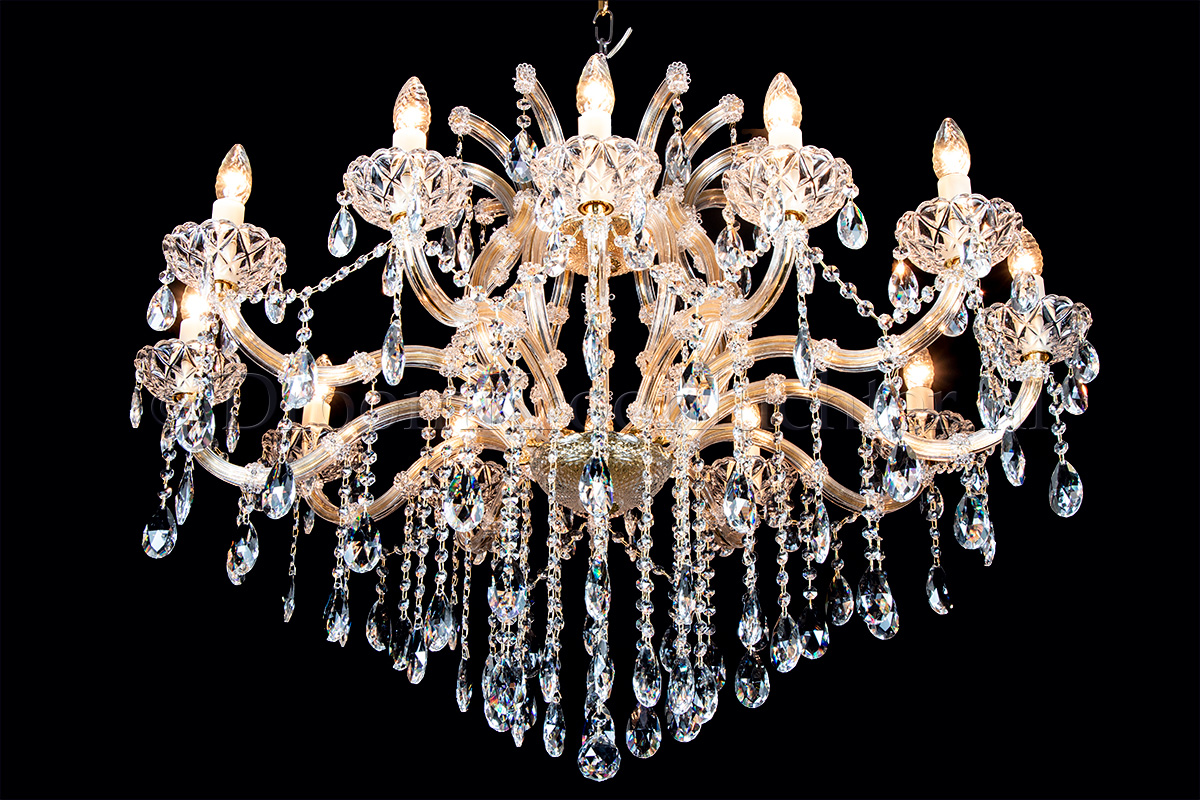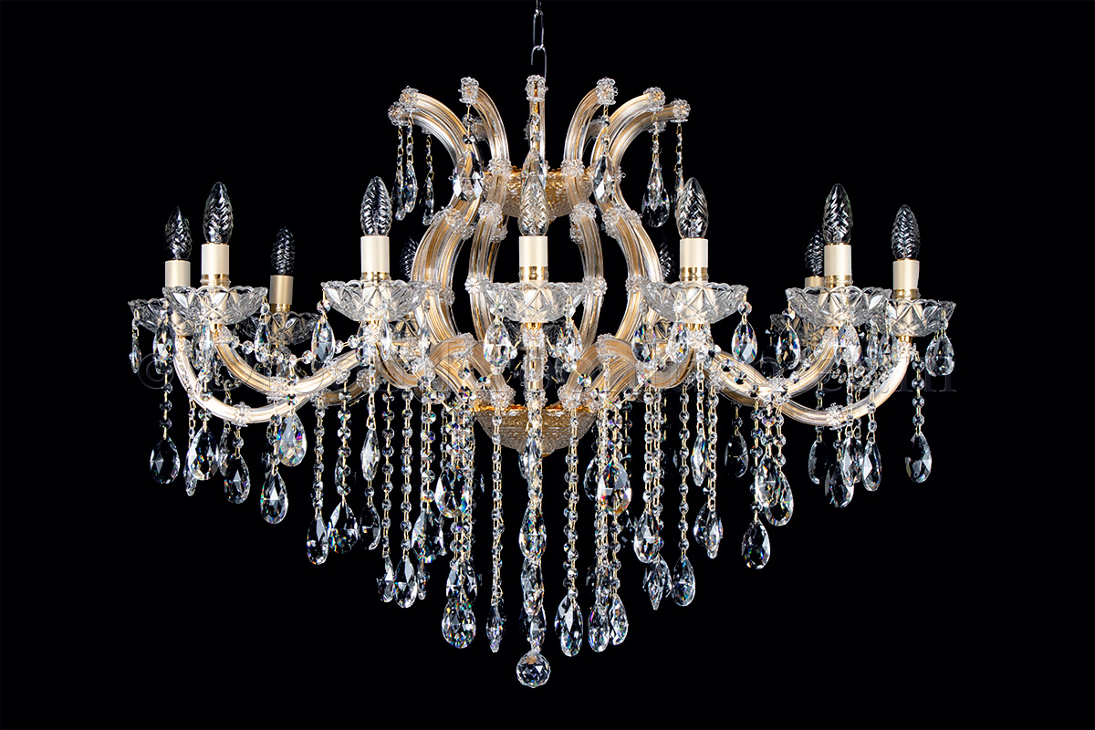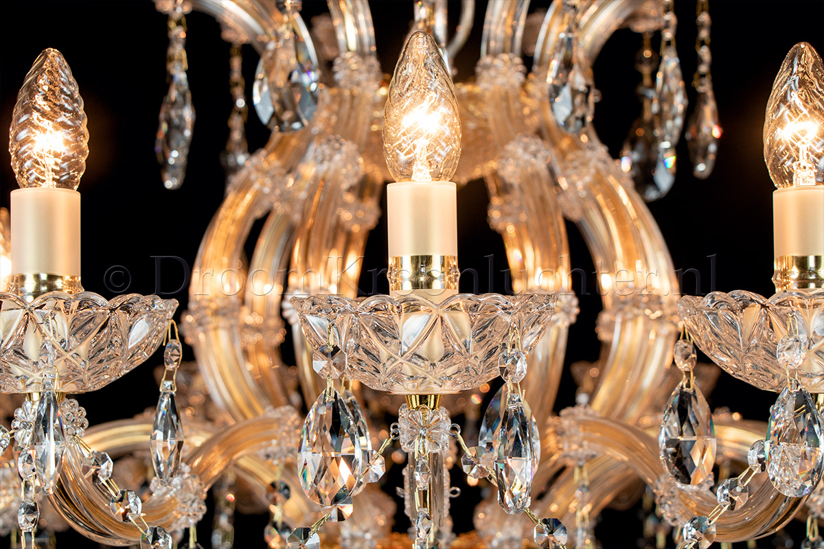 A beautiful glass chandelier with 15 arms. The glass chandelier Maria Theresa is gold coloured with ..