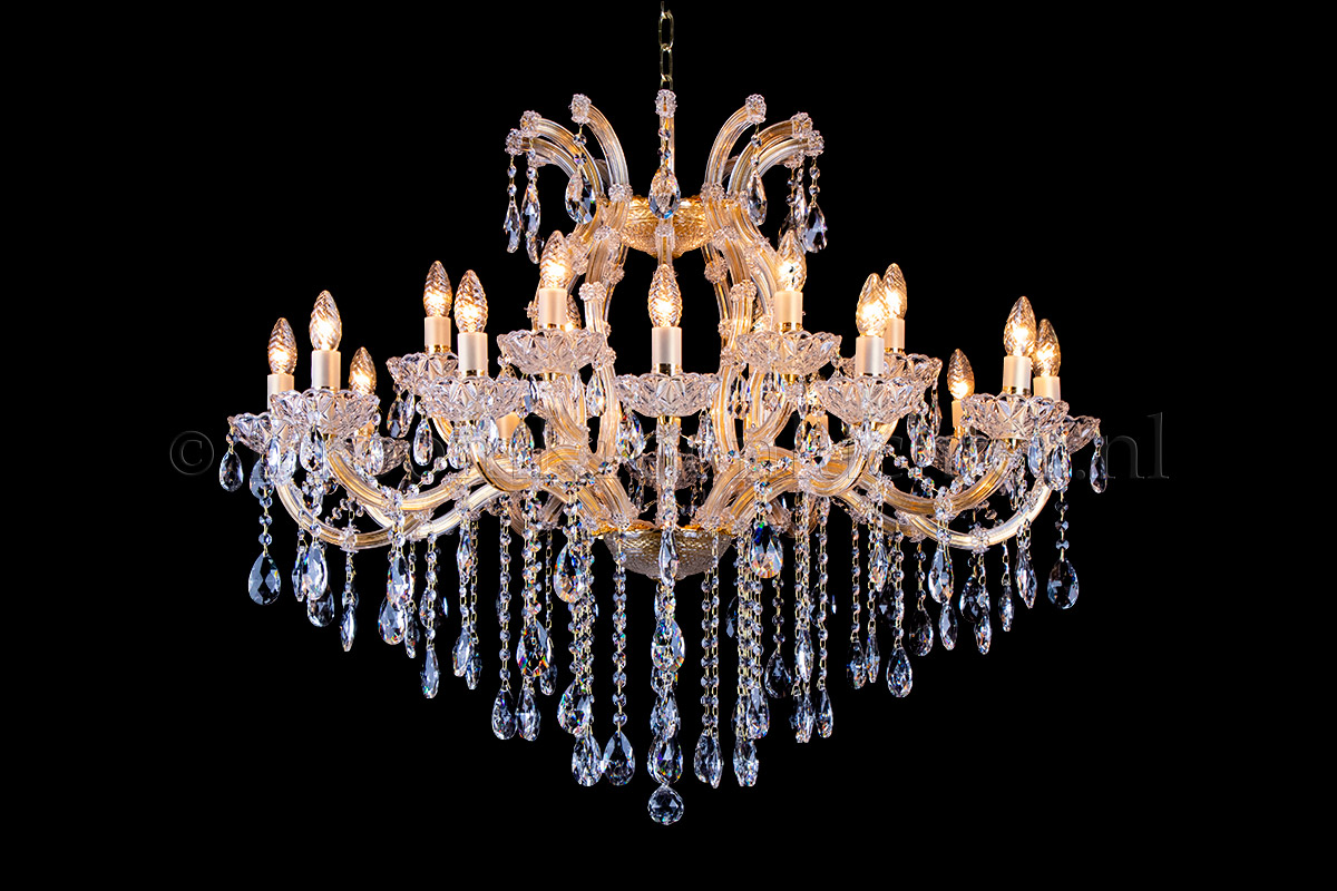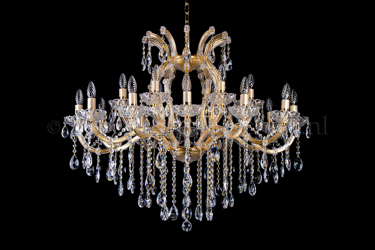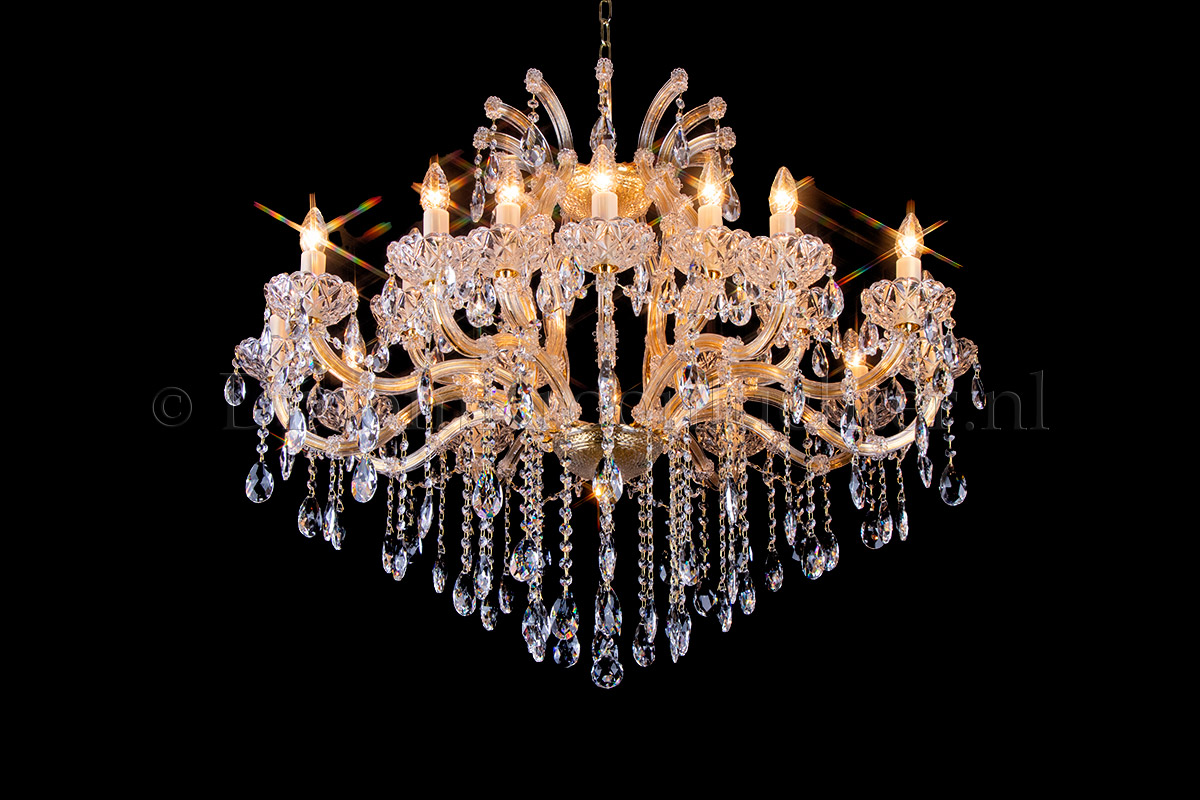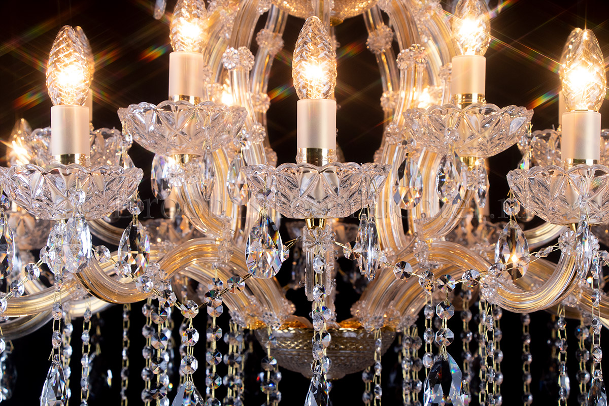 A beautiful glass chandelier with 15 arms. The glass chandelier Maria Theresa is gold coloured with ..