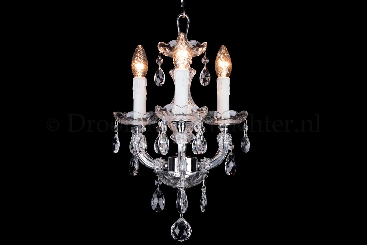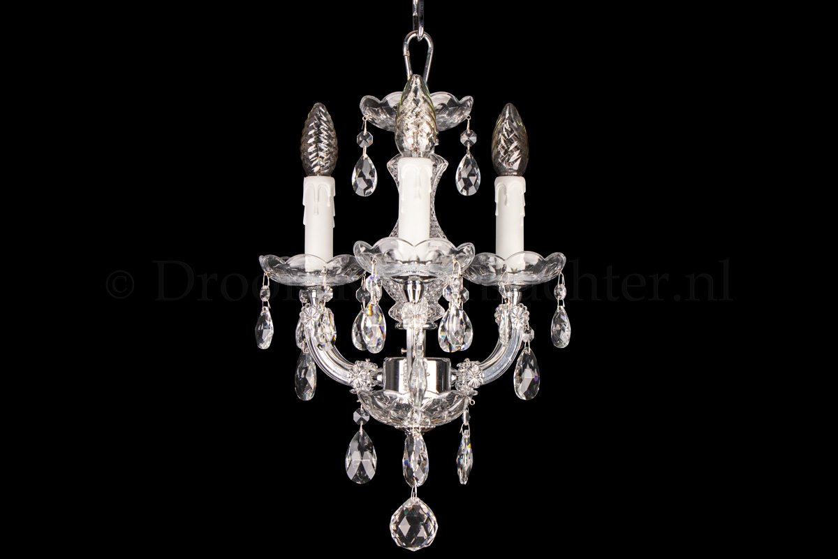 A beautiful glass chandelier with 3 arms. The glass chandelier Maria Theresa is chrome coloured with..
