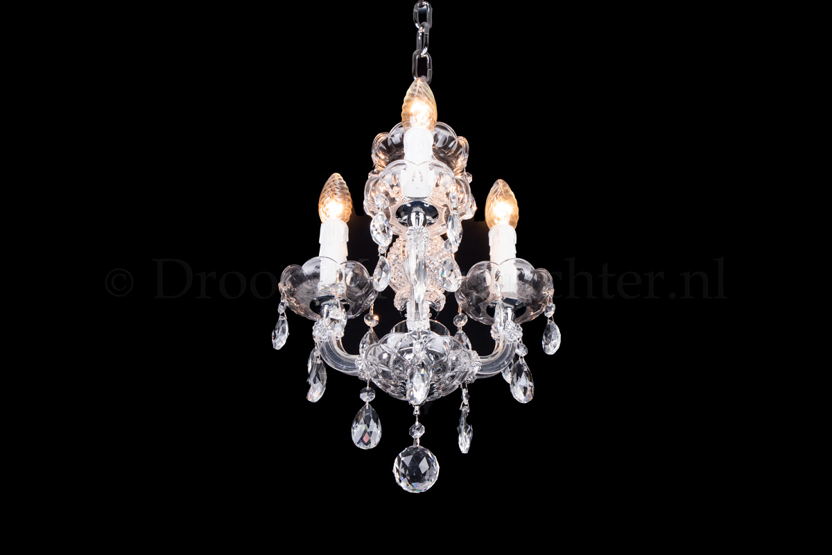 A beautiful glass chandelier with 5 arms. The glass chandelier Maria Theresa is chrome coloured with..
